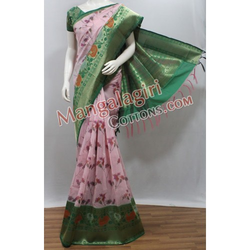 Mangalagiri Powerloom Cotton Chanderi Saree with Gold Zari Border. Saree comes with Unstitched Blouse Piece.
