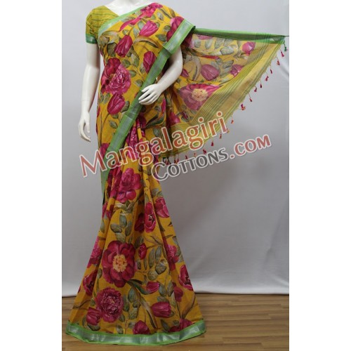Mangalagiri Powerloom Cotton Digital Printed Saree with Silver Zari Border. Saree comes with Unstitched Blouse Piece.