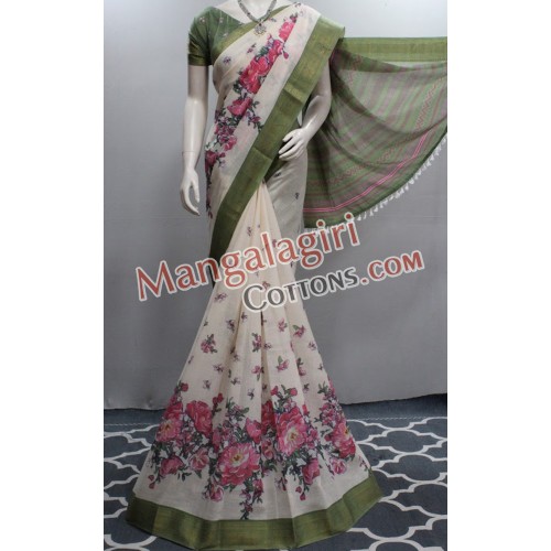Mangalagiri Powerloom Cotton Digital Printed Saree with Gold Zari Border. Saree comes with Unstitched Blouse Piece.