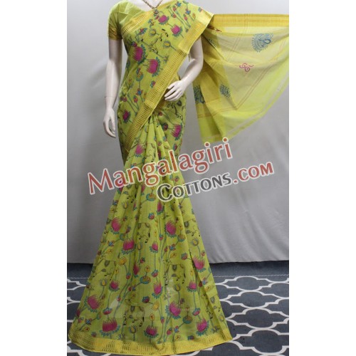 Mangalagiri Handloom Cotton Screen Printed Saree with Gold Zari Border. Saree comes with Unstitched Blouse Piece.