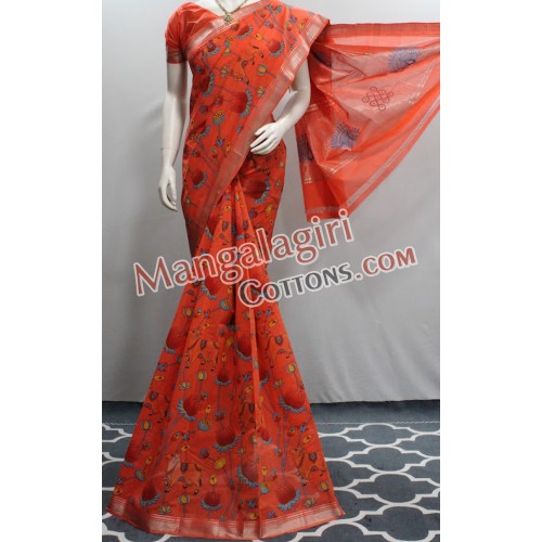 Mangalagiri Handloom Cotton Screen Printed Saree with Silver Zari Border. Saree comes with Unstitched Blouse Piece.