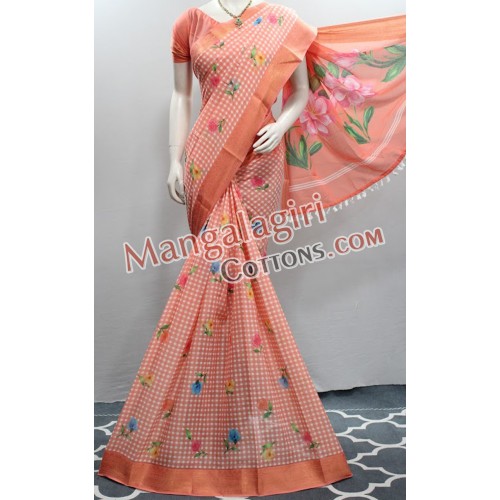 Mangalagiri Powerloom Cotton Digital Printed Saree with Gold Zari Border. Saree comes with Unstitched Blouse Piece.
