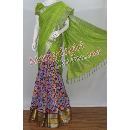 Printed Mangalagiri SemiPattu Langavoni Material. 3 Pieces set. Voni(Cotton+Silk Mix):3.00m, Langa(Cotton+Silk Mix):3.50m & Blouse(Cotton+Silk Mix):1.00m. Weaving pattern:Semi thick weaving.