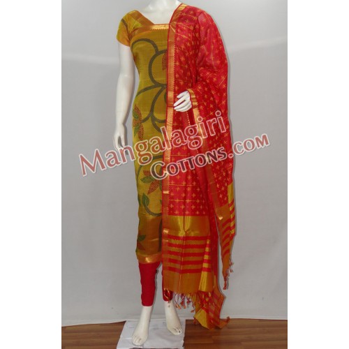 Printed Mangalagiri SemiPattu Dress Material. 3 Pieces set. Top(Cotton+Silk Mix):2.5m, Bottom(Cotton):2m & Duppata(Cotton+Silk Mix):2.5m. Weaving pattern:Semi thick weaving.