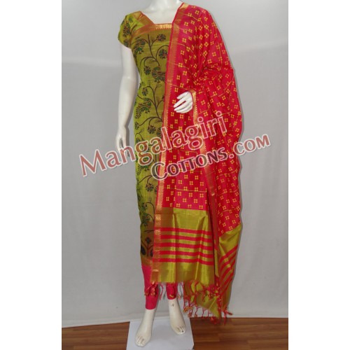 Printed Mangalagiri SemiPattu Dress Material. 3 Pieces set. Top(Cotton+Silk Mix):2.5m, Bottom(Cotton):2m & Duppata(Cotton+Silk Mix):2.5m. Weaving pattern:Semi thick weaving.