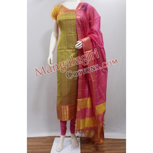 Mangalagiri SemiPattu Dress Material. 3 Pieces set. Top(Cotton+Silk Mix):2.5m, Bottom(Cotton):2m & Duppata(Cotton+Silk Mix):2.5m. Weaving pattern:Semi thick weaving.