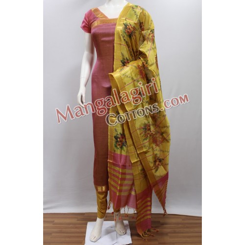 Printed Mangalagiri SemiPattu Dress Material. 3 Pieces set. Top(Cotton+Silk Mix):2.5m, Bottom(Cotton):2m & Duppata(Cotton+Silk Mix):2.5m. Weaving pattern:Semi thick weaving.
