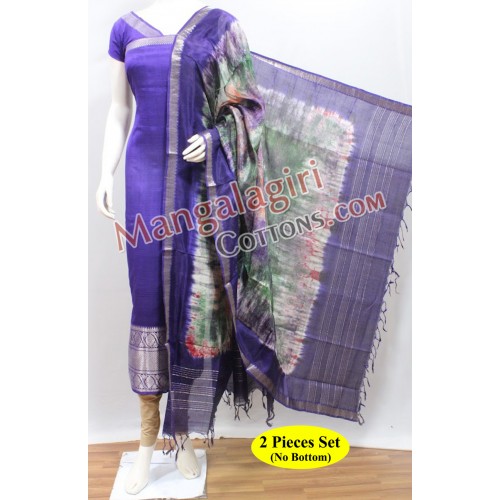 Mangalagiri Handloom Semi Pattu Top with Silver Zari Border and Semi Pattu Shibori Printed Dupatta. Unstitched 2 Pieces Set: