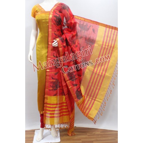 Mangalagiri Handloom Semi Pattu printed Dress Material with Gold Zari Border. Unstitched 3 Pieces Set: