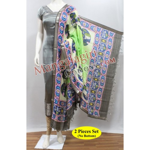 Mangalagiri Handloom Semi Pattu Silver Zari Border Top with Mangalagiri Handloom Semi Pattu Digital Print Dupatta. Unstitched 2 Pieces Set.