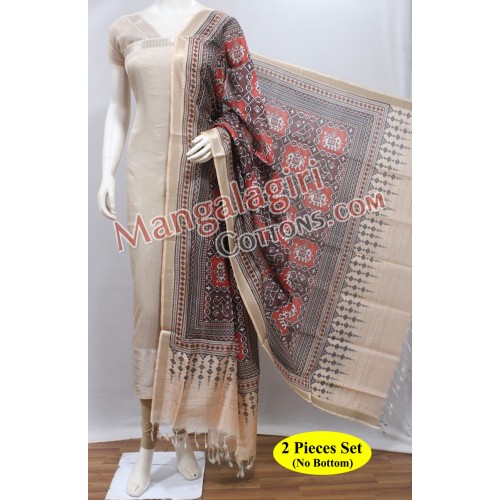 Mangalagiri Handloom Semi Pattu Top with Silver Zari Border and Semi Pattu Digital Print Dupatta. Unstitched 2 Pieces Set.