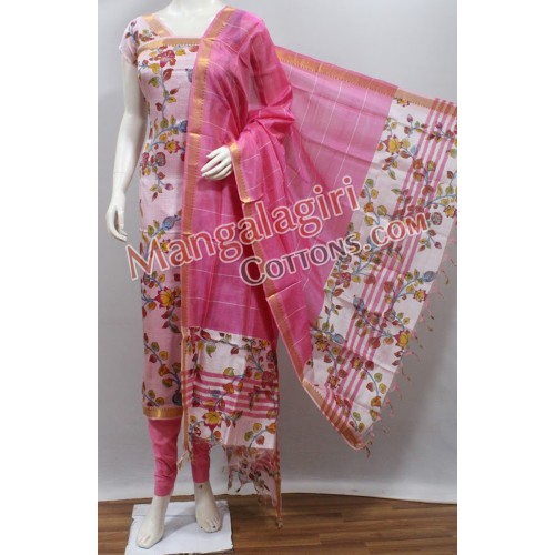 Mangalagiri Handloom Semi Pattu printed Dress Material with Gold Zari Border. Unstitched 3 Pieces Set:
