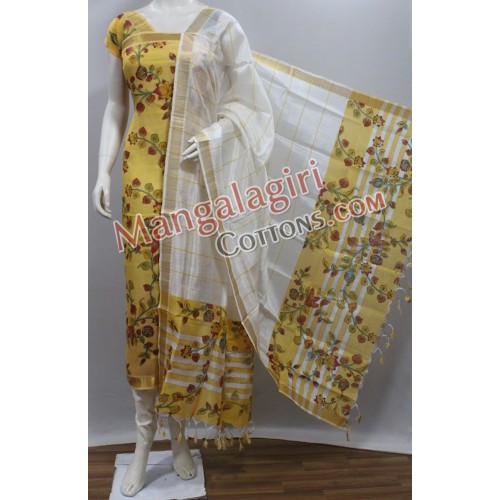 Mangalagiri Handloom Semi Pattu printed Dress Material with Gold Zari Border. Unstitched 3 Pieces Set: