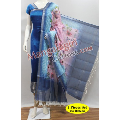 Mangalagiri Handloom Semi Pattu Top with Silver Zari Border and Semi Pattu Digital Print Dupatta. Unstitched 2 Pieces Set.