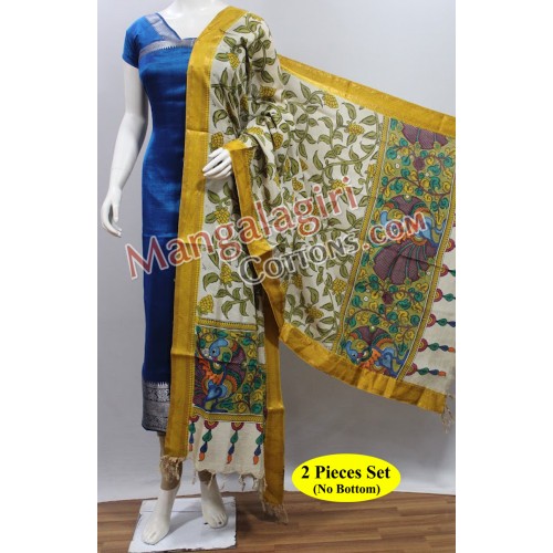 Mangalagiri Handloom Semipattu Silver Zari Border Top with Hand Painted Kalamkari Silk Dupatta. Unstitched 2 Pieces Set:
