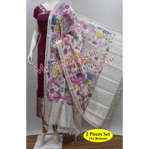 Mangalagiri Handloom Semi Pattu Top with Silver Zari Border and Semi Pattu Screen Print Dupatta. Unstitched 2 Pieces Set.