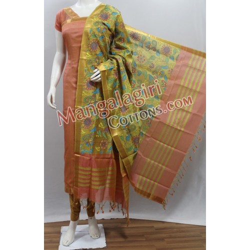Mangalagiri Handloom Semi Pattu Printed Dress Material with Gold Zari Border. Unstitched 3 Pieces Set: