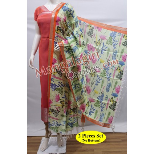 Mangalagiri Handloom Semi Pattu Top with Silver Zari Border and Semi Pattu Digital Print Dupatta. Unstitched 2 Pieces Set.