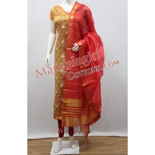 Mangalagiri Handloom Semi Pattu Dress Material with Gold Zari Border and Allover Chikankari work on Top Material. Unstitched 3 Pieces Set:
