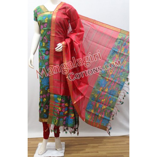 Mangalagiri Handloom Semi Pattu Printed Dress Material with Gold Zari Border. Unstitched 3 Pieces Set: