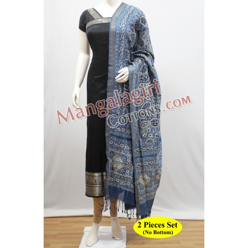 Mangalagiri Handloom Semi Pattu Top with Silver Zari Border and Semi Pattu Ajrakh Print Dupatta. Unstitched 2 Pieces Set.