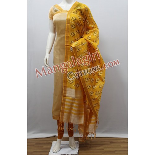Mangalagiri Handloom Semi Pattu Printed Dress Material with Gold Zari Border. Unstitched 3 Pieces Set: