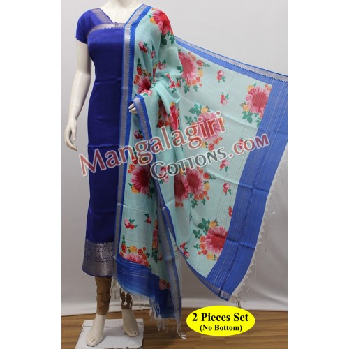 Mangalagiri Handloom Semi Pattu Top with Silver Zari Border and Semi Pattu Digital Print Dupatta. Unstitched 2 Pieces Set.