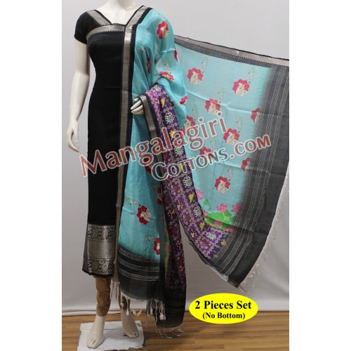 Mangalagiri Handloom Semi Pattu Top with Silver Zari Border and Semi Pattu Digital Print Dupatta. Unstitched 2 Pieces Set.