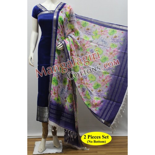 Mangalagiri Handloom Semi Pattu Top with Silver Zari Border and Semi Pattu Digital Print Dupatta. Unstitched 2 Pieces Set.