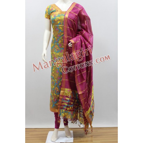 Mangalagiri Handloom Semi Pattu Printed Dress Material with Gold Zari Border. Unstitched 3 Pieces Set: