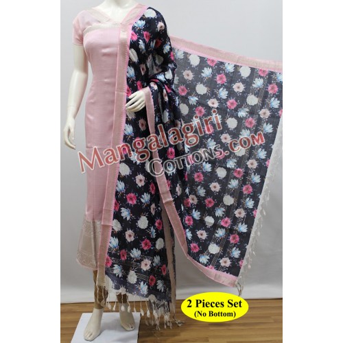Mangalagiri Handloom Semi Pattu Top with Silver Zari Border and Semi Pattu Digital Print Dupatta. Unstitched 2 Pieces Set.