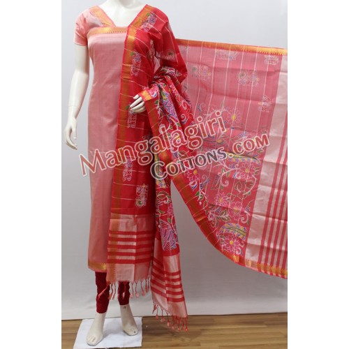 Mangalagiri Handloom Semi Pattu Printed Dress Material with Gold Zari Border. Unstitched 3 Pieces Set: