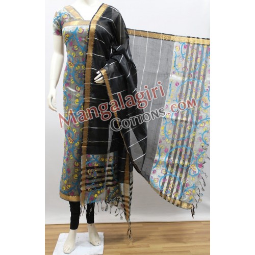 Mangalagiri Handloom Semi Pattu Printed Dress Material with Gold Zari Border. Unstitched 3 Pieces Set: