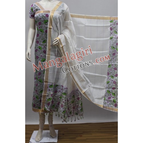 Mangalagiri Handloom Semi Pattu Printed Dress Material with Gold Zari Border. Unstitched 3 Pieces Set: