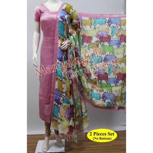 Mangalagiri Handloom Semi Pattu Top with Silver Zari and Semi Pattu Digital Print Dupatta. Unstitched 2 Pieces Set.