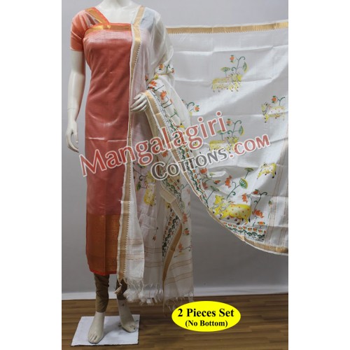 Mangalagiri Handloom Semi Pattu Top with Gold Zari Border and Semi Pattu Screen Print Dupatta. Unstitched 2 Pieces Set.