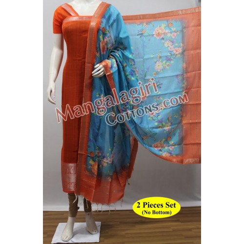 Mangalagiri Handloom Semi Pattu Top with Silver Zari Border and Semi Pattu Digital Print Dupatta. Unstitched 2 Pieces Set.