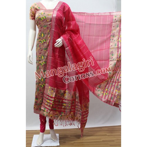 Mangalagiri Handloom Semi Pattu Printed Dress Material with Silver Zari Border. Unstitched 3 Pieces Set.