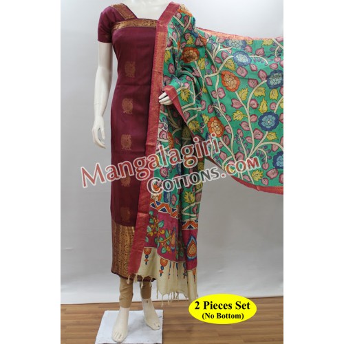 Mangalagiri Handloom Semi Pattu Butta Top with Gold Zari Border and Semi Pattu Handprint Kalamkari Dupatta With Nizam Border. Unstitched 2 Pieces Set.
