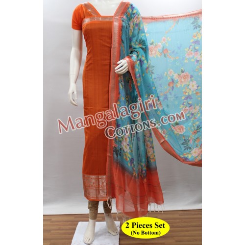 Mangalagiri Handloom Semi Pattu Top with Silver Zari Border and Semi Pattu Digital Print Dupatta. Unstitched 2 Pieces Set.