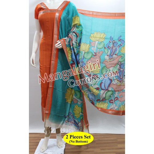 Mangalagiri Handloom Semi Pattu Top with Silver Zari Border and Semi Pattu Digital Print Dupatta. Unstitched 2 Pieces Set.