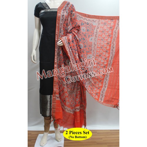 Mangalagiri Handloom Semi Pattu Top with Silver Zari Border and Semi Pattu Ajrakh Print Dupatta. Unstitched 2 Pieces Set.