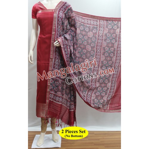 Mangalagiri Handloom Semi Pattu Top with Silver Zari Border and Semi Pattu Ajrakh Print Dupatta. Unstitched 2 Pieces Set.