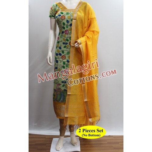 Mangalagiri Handloom Semi Pattu Digital Print Top with Silver Zari Border and Semi Pattu Plain Dupatta. Unstitched 2 Pieces Set.