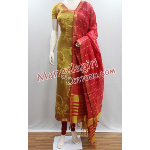 Mangalagiri Handloom Semi Pattu Dress Material with Gold Zari Border and Allover Chikankari work on Top Material. Unstitched 3 Pieces Set.