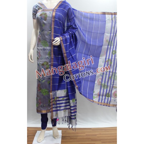 Mangalagiri Handloom Semi Pattu Printed Dress Material with Gold Zari Border. Unstitched 3 Pieces Set.
