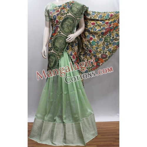 Mangalagiri Pure Handloom Semipattu Penkalamkari Langavoni Set. Set comes with unstitched blouse piece.
