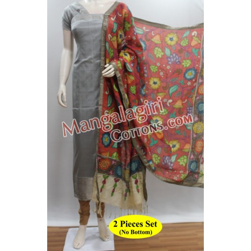 Mangalagiri Handloom Semi Pattu Top with Silver Zari Border and Semi Pattu Hand Print Dupatta. Unstitched 2 Pieces Set.