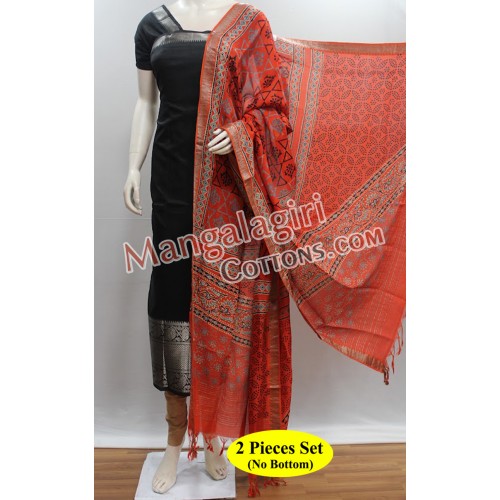 Mangalagiri Handloom Semi Pattu Top with Silver Zari Border and Semi Pattu Ajrakh Print Dupatta. Unstitched 2 Pieces Set.
