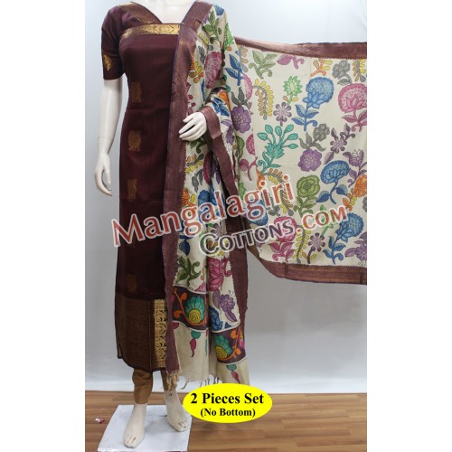 Mangalagiri Handloom Semi Pattu Butta Top with Gold Zari Border and Powerloom PenKalamkari Dupatta. Unstitched 2 Pieces Set.